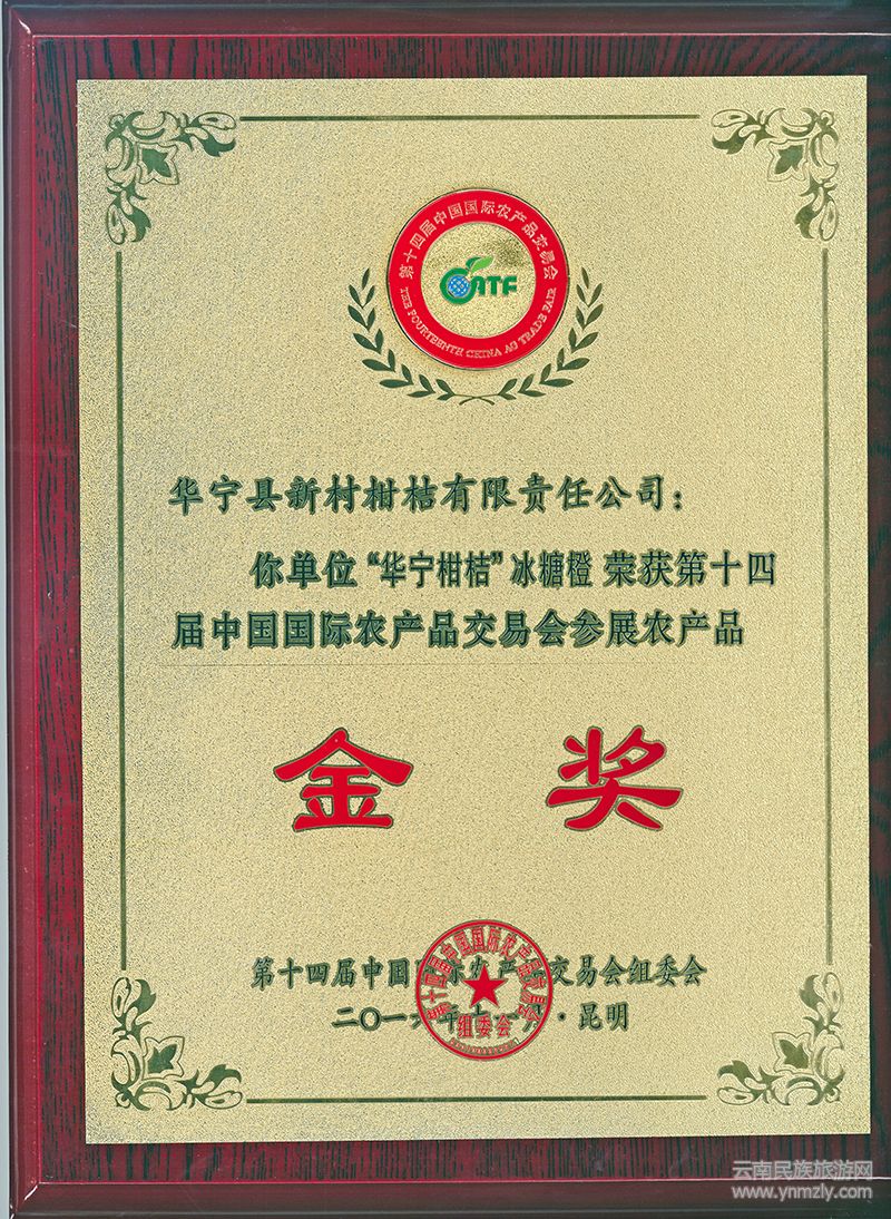 2016年11月公司產(chǎn)品華寧柑桔冰糖橙在第十四屆中國國際農(nóng)產(chǎn)品交易會參評會上榮獲“金獎”。
