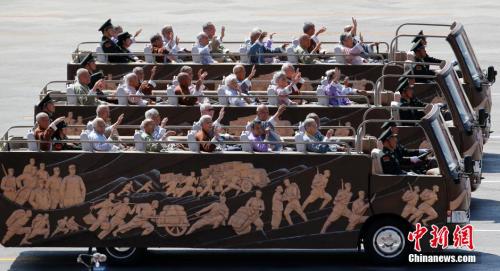 資料圖:2015年9月3日上午,紀(jì)念中國人民抗日戰(zhàn)爭暨世界反法西斯戰(zhàn)爭勝利70周年大會在北京隆重舉行。圖為抗戰(zhàn)老兵乘車方隊通過天安門廣場。中新社記者 盛佳鵬 攝
