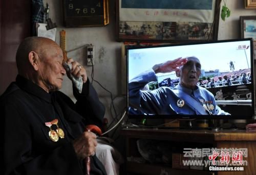 資料圖:2015年9月3日10時,河北滄州壘頭村86歲抗戰(zhàn)老兵祁玉相準(zhǔn)時坐在電視機前,和家人一起觀看“70周年大閱兵”。中新社發(fā) 翟羽佳 攝