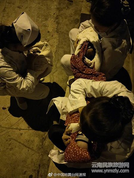 上圖為:通??h人民醫(yī)院的護(hù)士把新生兒抱到了室外避震。