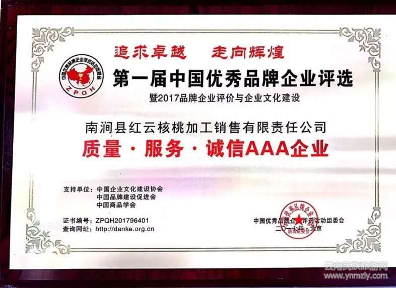 2011年11月,紅云核桃被南澗縣工商行政管理局、南澗縣個體私營經(jīng)濟協(xié)會評為“先進私營企業(yè)”;2012年,榮獲“南澗縣2011年度優(yōu)秀民營工業(yè)企業(yè)”;2014年9月榮獲中國民族貿易促進會、中國民族報社等7家單位組織的“大眾口碑獎”;2015年被中國產(chǎn)品質量檢驗檢疫中心、中國企業(yè)信用評估管理委員會評為質量、服務、誠信AAA企業(yè);2015年12月“無量山跳菜核桃牌核桃仁”被云南省實施品牌和質量興省戰(zhàn)略領導小組評為“云南名牌產(chǎn)品”;2016年1月,榮獲“旅游休閑食品類銀獎”;2016年榮獲第十四屆中國國際農(nóng)副產(chǎn)品交易會“金獎”;2016年12月“無量山跳菜核桃”商標被省工商局認定為“云南省著名商標”; 2017年榮獲昆明核桃產(chǎn)業(yè)博覽會金獎;2017年榮獲云南·昆明核桃博覽會組織獎;昆明核桃產(chǎn)業(yè)博覽會金獎;“2017云南年度營銷獎創(chuàng)新創(chuàng)業(yè)獎“;同年獲得“質量·服務·誠信AAA企業(yè)”; 2018年榮獲“云南省五一勞動獎狀”;“2018年云南匠心品牌”;“2018年云南省20佳創(chuàng)新企業(yè)”;同年10月榮獲“2018年云南.昆明堅果博覽會休閑食品類金獎”;11月份入選云南省2018年十大名果并獲得2018年綠色食品20佳創(chuàng)新企業(yè)。