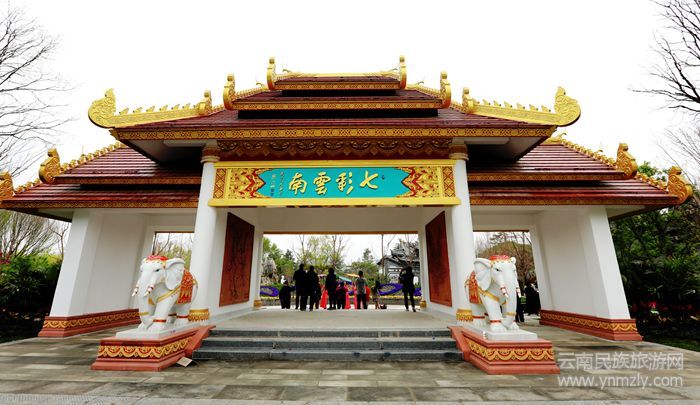 鎏金的傣族風(fēng)格門樓上寫著“七彩云南”,兩頭憨態(tài)可掬的“吉象”立于兩側(cè),這就是云南園的第一景——吉象迎賓。“吉象”以亞洲象為原型設(shè)計(jì),卷鼻造型寓意為“吉祥如意。穿過門廊,腳下是彩色鋪裝拼花的紋案,眼前是色彩斑斕的鮮花組景——雀舞廣場豁然呈現(xiàn)在眼前。