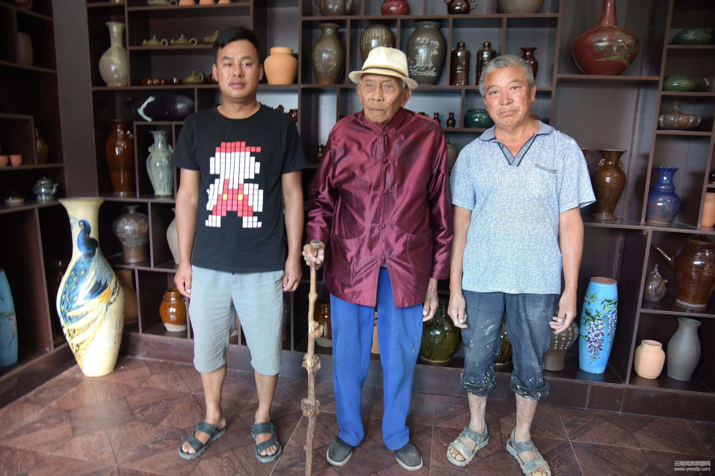 ▲三代制陶人:84歲的省級(jí)制陶非遺傳承人姬仁禮(中)、保山市市級(jí)制陶非遺傳承人姬叢鵬(右)、姬叢鵬的女婿包光羅(左)合影