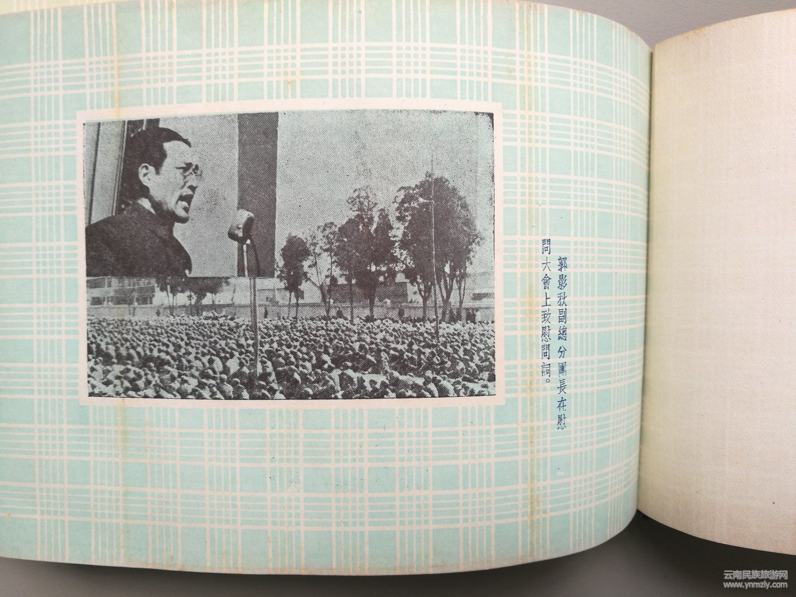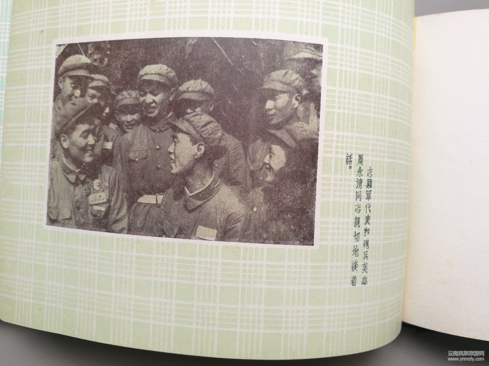 我收藏的這本《紀(jì)念冊》,是云南軍區(qū)為全國人民慰問人民解放軍代表團(tuán)西南總分團(tuán)的慰問活動制作的紀(jì)念冊。紫絨布面,彩色卡紙,印刷精美。冊內(nèi)收集了幾十幅全國人民慰問解放軍代表團(tuán)在云南的慰問活動的工作照片,是云南歷史文化的珍貴史料。圖片包括云南軍區(qū)政委謝富治赴昆明站歡迎代表團(tuán)代表同志;
