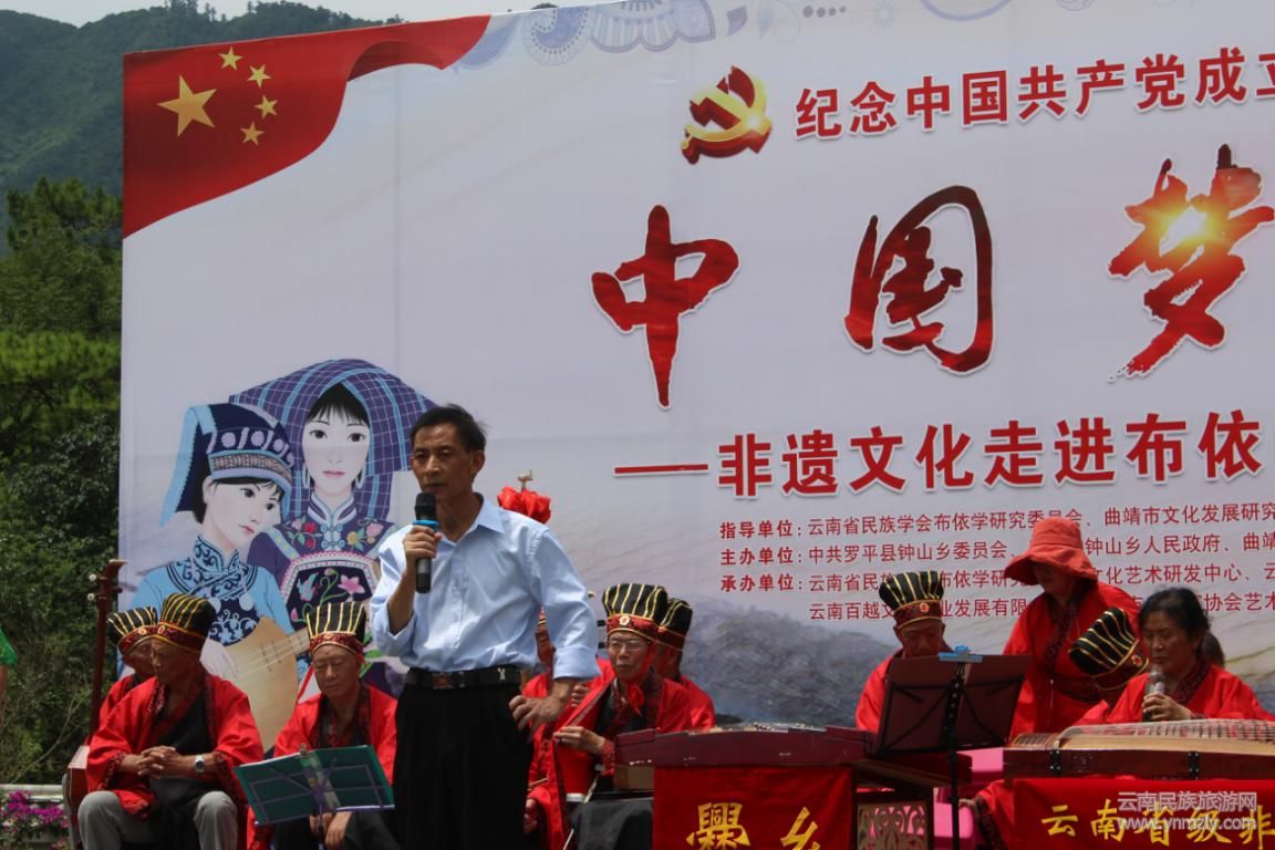 6月28日,由云南省民族學(xué)會布依學(xué)研究委員會、曲靖市文化發(fā)展研究中心指導(dǎo);中共羅平縣鐘山鄉(xiāng)黨委政府、曲靖市洞經(jīng)音樂協(xié)會主辦;“紀(jì)念中國共產(chǎn)黨成立98周年、新中國成立70周年“中國夢 布依情”非遺文化走進(jìn)布依山寨魯布革主題文藝演出”(以下簡稱主題文藝演出)在羅平縣魯布革布依山寨精彩亮相。云南省民族學(xué)會布依學(xué)研究委員會會長韋光文作指導(dǎo)發(fā)言。演出活動由曲靖市洞經(jīng)音樂藝術(shù)團(tuán)主持人古麗華主持,來自省市縣鄉(xiāng)四級領(lǐng)導(dǎo)嘉賓與鐘山鄉(xiāng)魯布革村的廣大群眾以及魯布革完小的師生約500余人觀看演出。