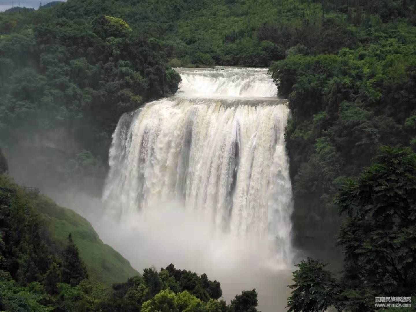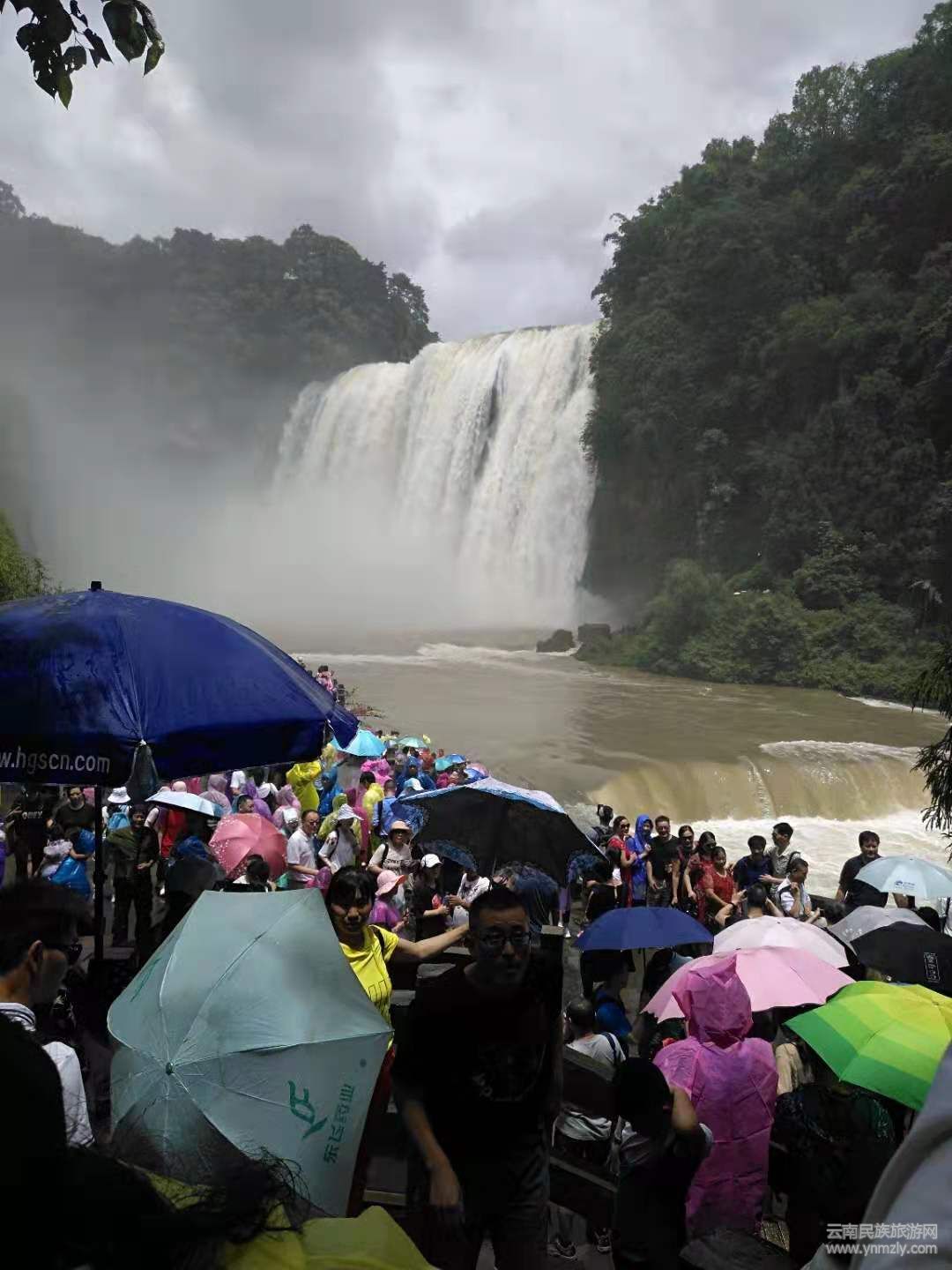稍前近觀,瀑布如黃河倒傾,峭壁震顫,谷底轟雷,十里外也能聽(tīng)到咆哮聲。由于水流的強(qiáng)大沖擊力,濺起的水霧可彌漫數(shù)百米以外,使坐落在瀑布左側(cè)崖頂上的寨子和街市,也常被濺起的水霧所籠罩。
