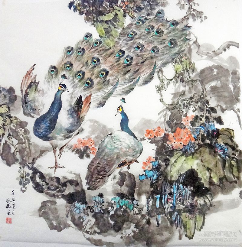 風(fēng)楊先生深諳藝術(shù)之“道”。數(shù)十年來(lái),他堅(jiān)持游歷云南各地,感悟大自然的壯美與靈秀、風(fēng)骨與神韻,從大自然中汲取無(wú)盡的養(yǎng)分,滋潤(rùn)胸襟,豐富畫(huà)材,提煉意境。1997年,為了畫(huà)好孔雀,他曾在西雙版納一待就是半個(gè)月,同時(shí)還時(shí)不時(shí)到昆明動(dòng)物園寫(xiě)生,認(rèn)真觀察、速寫(xiě)了孔雀頭頸、冠羽、嘴、體形、腿、腳、爪等各種動(dòng)態(tài)表現(xiàn),然后以心中的“無(wú)法則大法”理念和唯美主義審美觀,來(lái)創(chuàng)作表現(xiàn)和傳達(dá)自己心中的孔雀;讓孔雀流淌出思想、展現(xiàn)出獨(dú)到的藝術(shù)語(yǔ)言。