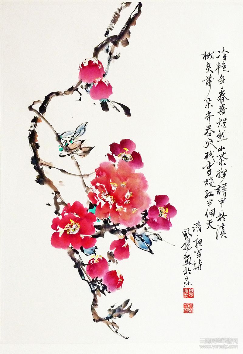 風(fēng)楊繪畫(huà)造詣深厚,除擅長(zhǎng)寫(xiě)意孔雀外,他在花卉、人物畫(huà)等方面也有不凡的實(shí)力。如他的花卉《傲雪》,描寫(xiě)了白雪皚皚的世界傲然挺立的梅花。畫(huà)面上一樹(shù)紅梅盤(pán)曲而立;以老干新蕊造型,較好地展現(xiàn)了梅花的孤俏冷艷與錚錚傲骨。還有意思的是,梅間一只吱吱喳喳的麻雀,卻不畏嚴(yán)寒鳴跳嬉戲著。他的《冷艷爭(zhēng)春》,畫(huà)上一枝山茶斜著插下,寥寥數(shù)筆,就將清.擔(dān)當(dāng)詩(shī)句:“冷艷爭(zhēng)春喜爛然,山茶按譜甲于滇,樹(shù)頭萬(wàn)朵齊吞火,殘雪燒紅半個(gè)天”做了完美呈現(xiàn)。又如他的人物畫(huà)《傣家少女》,樸實(shí)而浪漫,明快而典雅,點(diǎn)、線、面、體和色彩的成熟運(yùn)用,成為他盡情抒發(fā)內(nèi)心思緒的語(yǔ)言特色,是充滿生活激情詩(shī)的繪畫(huà)。他的《打漁歸來(lái)》,描寫(xiě)了白族姑娘勞作后的情景。畫(huà)中一枝綠葉從右上方伸出,一位美麗的白族姑娘,肩上竹桿掛著漁網(wǎng)、身背漁框,生動(dòng)活潑地表現(xiàn)了白族人民勤勞善良,具有較強(qiáng)的藝術(shù)感染力。