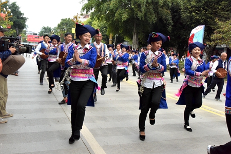 全國人大民委、國家民委祝賀團(tuán),云南省祝賀團(tuán)及普洱市祝賀團(tuán)到會祝賀?,F(xiàn)場舉行慶祝方隊巡游入場儀式和萬人同唱國歌活動,各方嘉賓與墨江縣各族群眾一起歡度盛會。