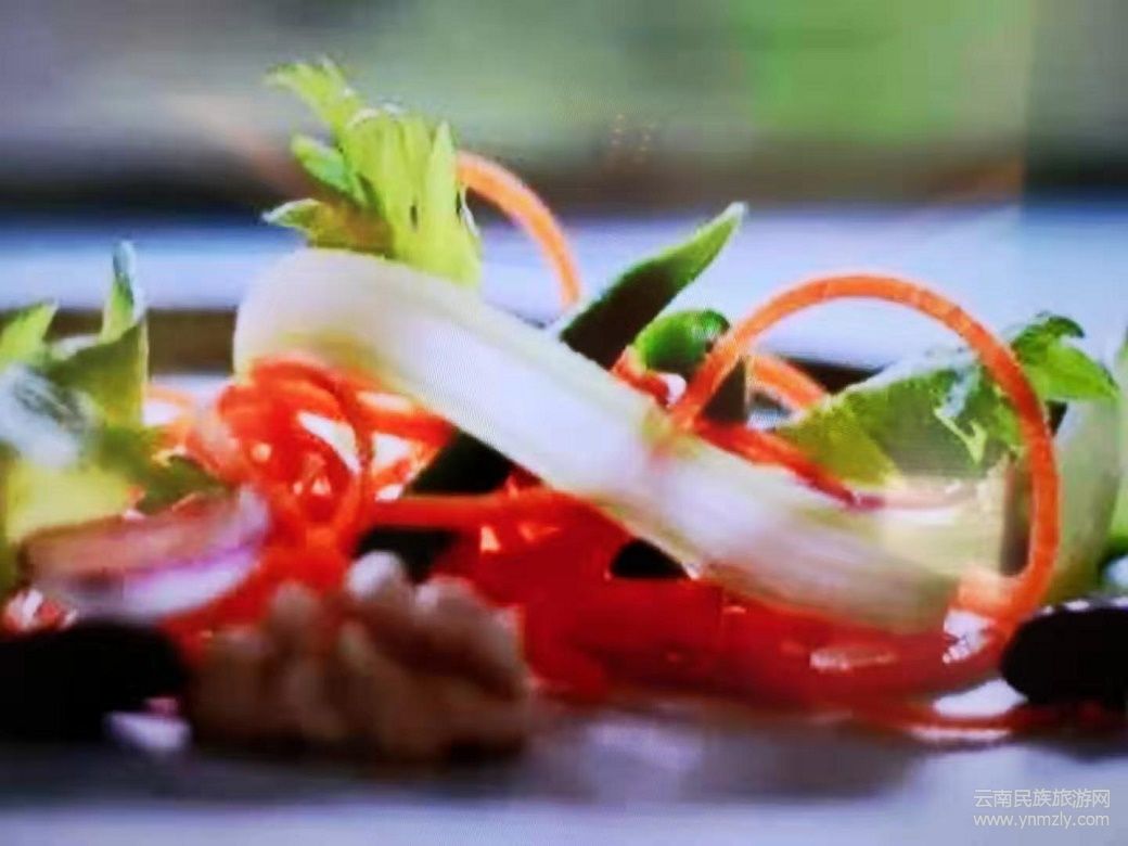 第一道(開胃菜)清風沙拉,食料主要是冰草,帶有天然的植物鹽,單吃細嫩無渣,再搭配時令蔬菜做成沙拉。道家飲食之道講究素勝于葷,同時主廚順應自讓之道,正是“自然時復有清風”。我們在這不老谷中清風徐來拂去煩惱,一口清逸即入心。同時與這道菜搭配的是冰糖木瓜水,與清風沙拉相配,一清爽、一酸甜輕啟“素道”美食之旅。