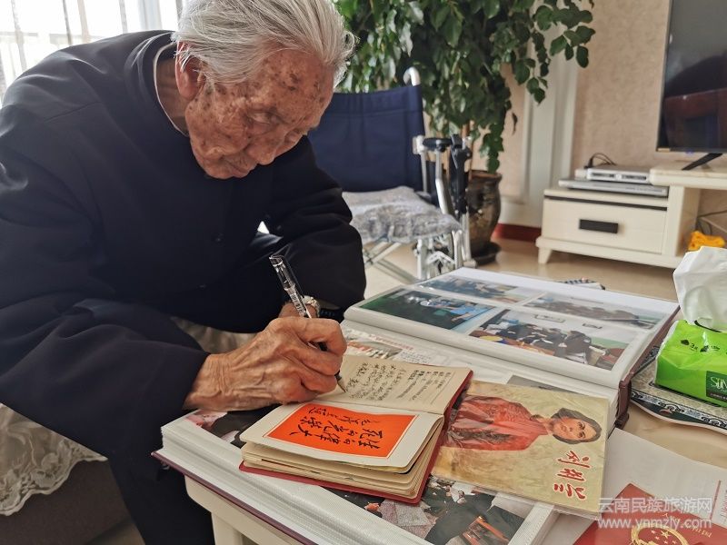 ▲梁改蓮老人在記者的劉胡蘭紀念冊上寫下留言