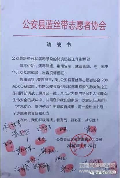 云南民族旅游網(wǎng)訊:2020年1月,新型冠狀病毒引發(fā)的肺炎疫情開始蔓延。危難之際,公安縣“藍(lán)絲帶”志愿者協(xié)會(huì)會(huì)長、支部副書記甘輝芳來到縣疫情防控指揮部,遞上會(huì)員們簽字按著紅指印的請(qǐng)戰(zhàn)書,用一腔熱血書寫了他們的責(zé)任和擔(dān)當(dāng)。短時(shí)間內(nèi),在黨員的帶領(lǐng)下,廣大會(huì)員紛紛行動(dòng)起來,奔赴疫情一線陣地。