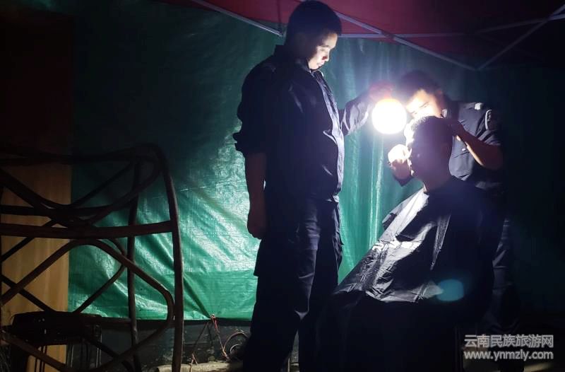 跑了好幾個(gè)地方,何志遠(yuǎn)從白天一直忙活到了晚上。戰(zhàn)友提著燈給他照明。借著微弱的光幫戰(zhàn)友理發(fā)的何志遠(yuǎn),就是西盟佤山最帥的TONY老師,這暖心畫(huà)面定格在了大家的心里。
