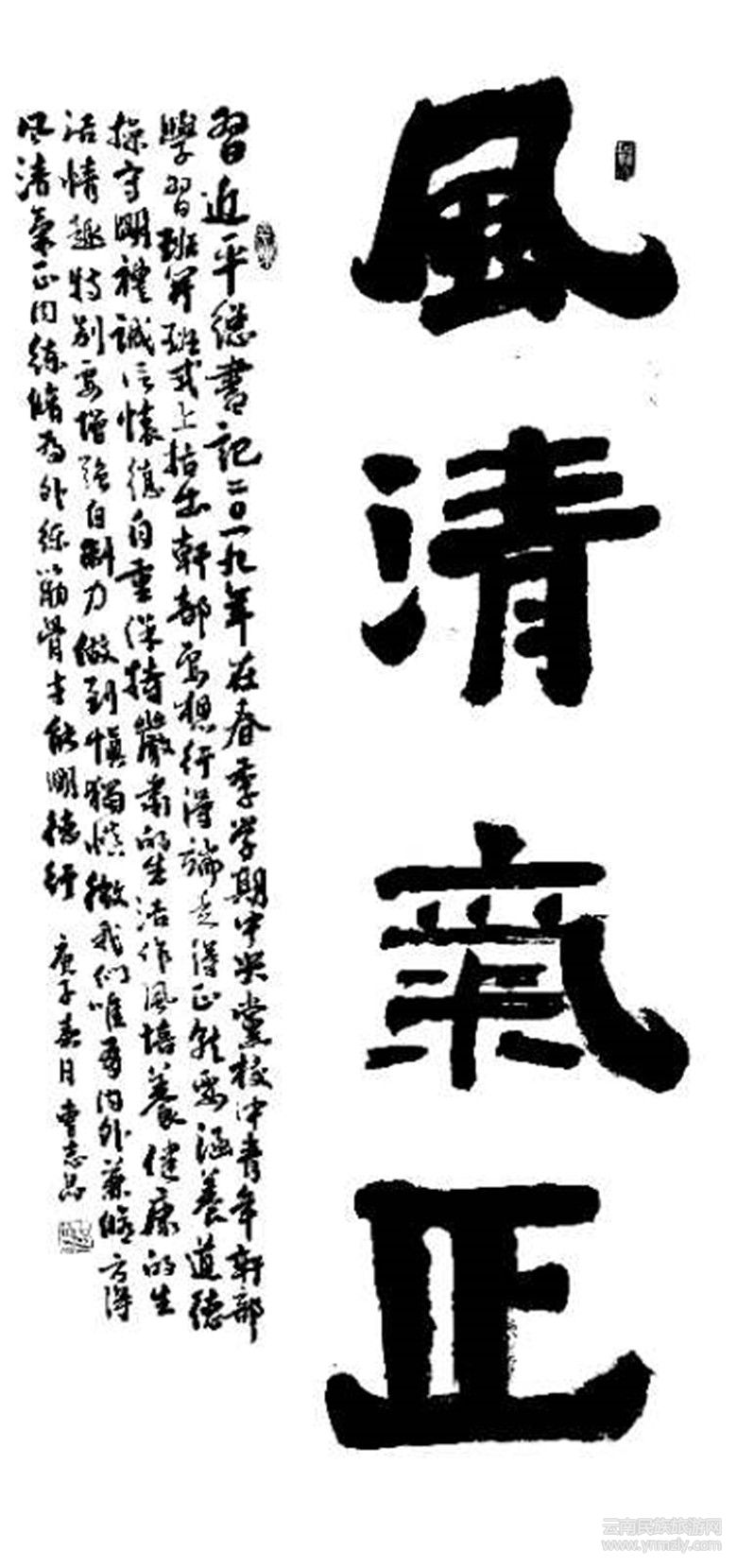 其書法以帖學(xué)為宗,繼承“二王”,傳承經(jīng)典,不斷從王羲之、王獻(xiàn)之及趙孟頫、褚遂良、王鐸、董其昌等書學(xué)中汲取營養(yǎng),形成端正儒雅、清秀飄逸的風(fēng)格特點(diǎn)。楷書根基源自王寵,兼收褚遂良的技巧特點(diǎn),用筆端穩(wěn)嫻熟,扎實(shí)而靈動,筆法富有生氣、力量和陽剛精神,雄渾豪放,神工化一。