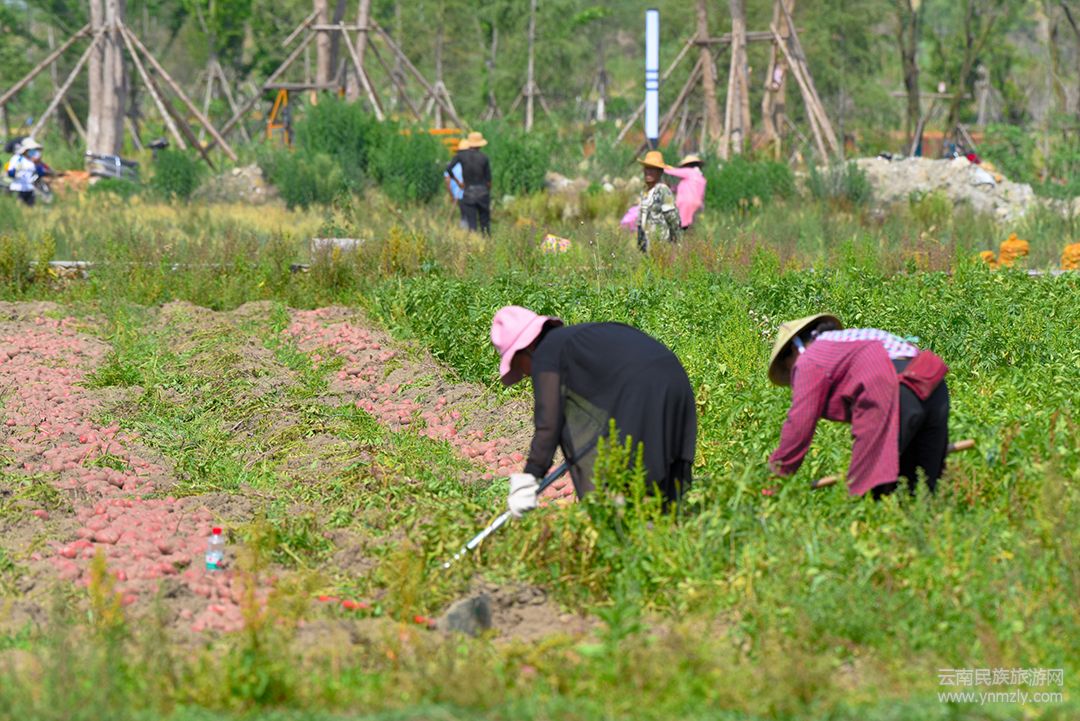 這段時(shí)間的右甸壩,挖洋芋同樣是主要的農(nóng)事,農(nóng)民們先是把還綠的洋芋樹扯到半邊,然后熟練地用鋤頭挖開,然后將一個(gè)個(gè)洋芋撿出來,用精準(zhǔn)的手法扔進(jìn)堆里。隨著鋤頭飛舞,一個(gè)個(gè)成熟的紅皮洋芋從泥土里鉆出來后,以一條條優(yōu)美的弧線,在人們的臉上飛出一個(gè)個(gè)燦爛的笑臉。