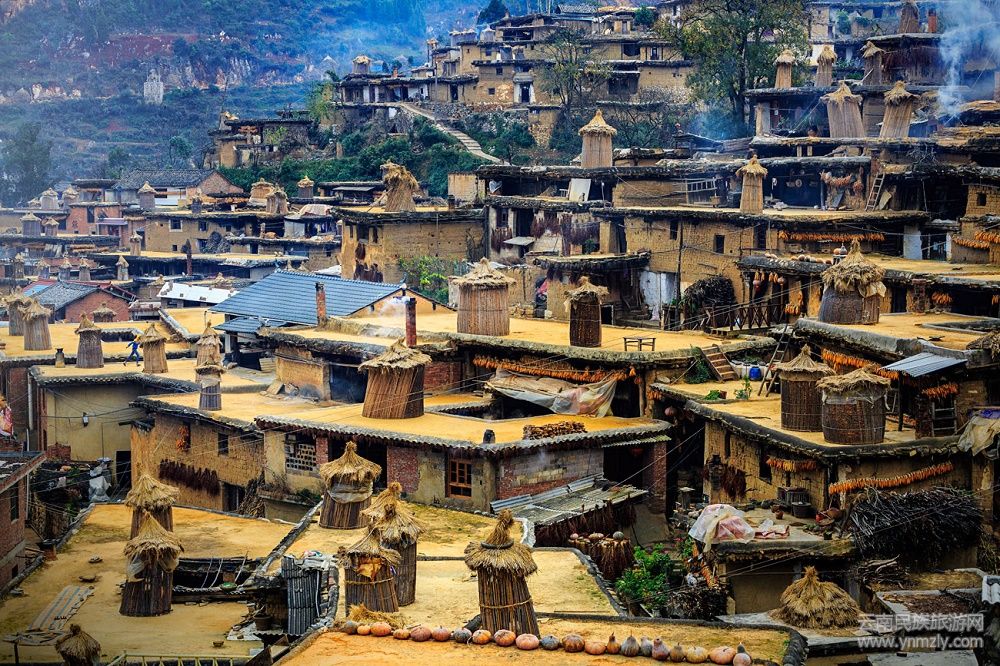 “相傳,古村中一位叫阿嗄的彝家小伙,為改變村民住洞穴、棲樹(shù)枝的原始居住方法,在飛鳳坡頂,冥思苦想了三天三夜后,到山中砍來(lái)六百六十六棵栗樹(shù),挑來(lái)九百九十九挑粘土。用土筑墻,墻上橫搭木料,密鋪木棍、茅草,再鋪一層土;土皮頭灑水,然后用石頭一層層夯結(jié)實(shí)。就這樣,一幢幢左右連接、上下相通的土庫(kù)房,就在飛凰山坡被建造出來(lái)……”