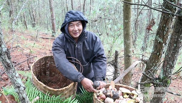 蔣開(kāi)洪從早上我6點(diǎn)到9點(diǎn),翻山越嶺,走遍了自己熟知的5個(gè)菌塘。采摘到了滿滿一籮筐新鮮的野生菌。他會(huì)把他們交售到當(dāng)?shù)匾患倚∮忻麣獾囊吧r(nóng)家樂(lè),賺取自己一天的收入。