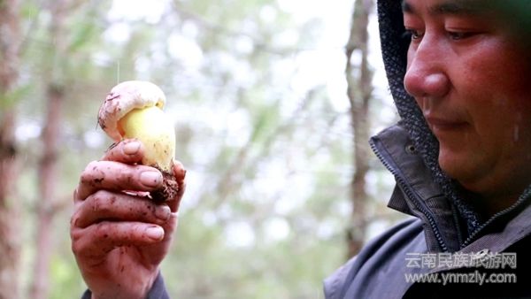 要想烹飪出來(lái)的野生菌味道鮮美,所選食材必須是當(dāng)天剛剛采到的野生菌。一大早,村民蔣開(kāi)洪便來(lái)到山林里采野生菌。