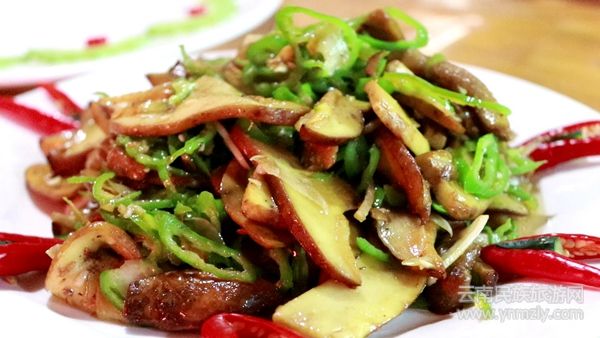 粉菌,作為野生菌的“主力軍”,在姚關(guān)久遠(yuǎn)的飲食文化中演化出了多種做法,而今天海艷給我們做的就是一種最大眾的做法——粉菌炒辣椒。只見(jiàn)她將早上新摘的粉菌洗好后切片,將油燒熱,當(dāng)油溫合適后放入粉菌,炒熟后備用。再放入姜絲、蔥片、辣椒絲、花椒,當(dāng)聞到佐料香味后放入備用的粉菌,將粉菌的清香與佐料的鮮香充分結(jié)合。一道美味的粉菌炒辣椒就新鮮出鍋了。