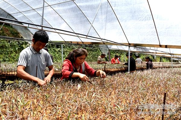 當(dāng)?shù)卮迕窬徒鼊?wù)工,圖為村民正在中草藥種植基地上打理石斛苗