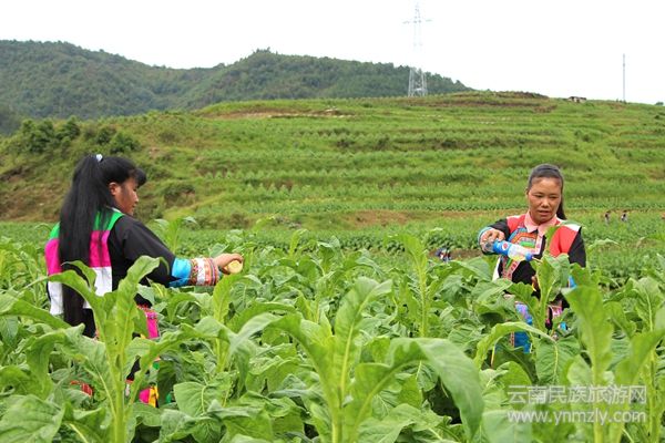 傈僳族村民在烤煙地里封頂打杈