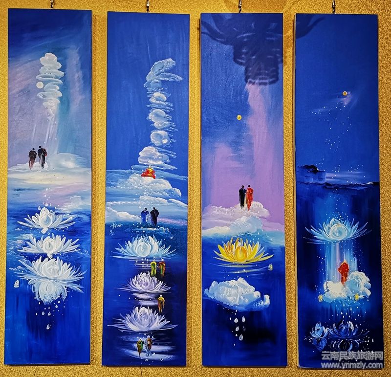 其繪畫以蓮花為主題,大膽運(yùn)用藍(lán)色調(diào),渲染出瑰麗奢華、風(fēng)采迷人的般若世界!他的蓮花被稱為“大寶七彩蓮花”。他用油畫的方式表現(xiàn)出了最美的中國味,把中國紅、中國藍(lán)這兩種最本源的色彩做了最深最美的詮釋,可以說他開創(chuàng)了一種新的風(fēng)格“油畫技法,國畫風(fēng)格”。