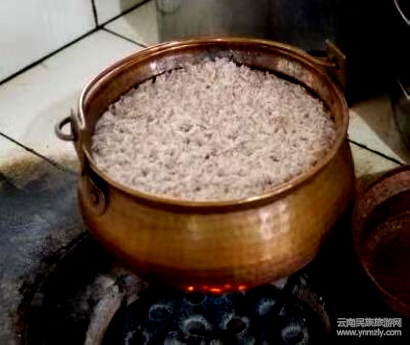 2. 烹制。大米淘洗后放入電飯煲,普洱茶滾水浸泡后倒去第一泡水,再次注入滾水,五分鐘后,將茶水(足夠的量)注入電飯煲,放入豬油,按下煮飯鍵,至熟即可。