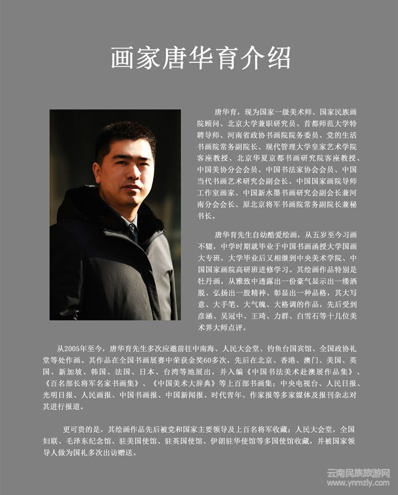 唐華育,現(xiàn)為國家一級美術(shù)師、國家民族畫院顧問、北京大學兼職研究員、首都師范大學特聘導師、河南省政協(xié) 書畫院院務委員、黨的生活書畫院常務副院長、現(xiàn)代管理大學皇家藝術(shù)學院客座教授、北京華夏京都書畫研究院客座教授、中國美協(xié)分會會員、中國書法家協(xié)會會員、中國當代書畫藝術(shù)研究會副會長、中國國家畫院導師工作室畫家、中國新水墨書畫研究會副會長兼河南分會會長、原北京將軍書畫院常務副院長兼秘書長。