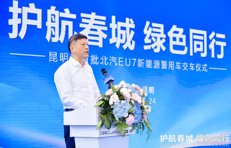 6月24日, “護(hù)航春城 綠色同行” —昆明市首批北京EU7新能源警用車正式交付儀式在昆明圓滿舉辦。云南省委常委、昆明市委書記程連元現(xiàn)場(chǎng)見證交車儀式,云南省、昆明市相關(guān)領(lǐng)導(dǎo)出席交車儀式。