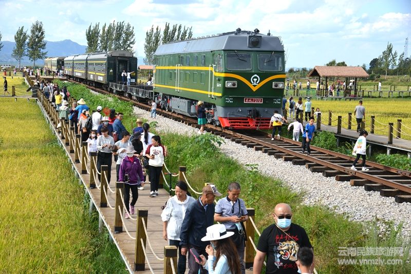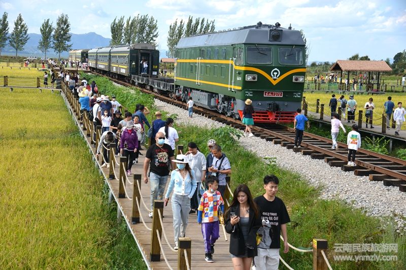 慕名前來的游客們沿著稻田邊的景觀棧道,一路感受田園風(fēng)光、體驗(yàn)農(nóng)耕文化,與穿越稻田的網(wǎng)紅綠皮小火車拍照留影。