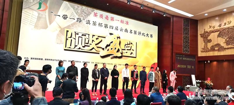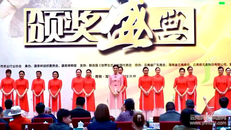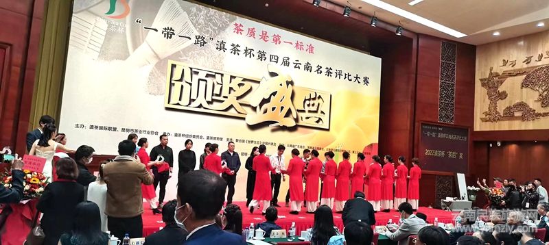 11月19日晚7點在昆明海埂會堂舉行頒獎盛典并舉辦2022“滇茶絲路行”全國巡回展昆明站首展。全球滇茶經銷商、采購商、廣大茶友零距離瞻仰金象獎“茶王”風采。著名女高音歌唱家燕妮、著名男中音歌唱家周楠、華語情歌王子李明翰、栗粟族青年歌唱家小綿羊、云南著名歌唱家張文婷、李雅潔等藝人和云南茶藝大師黃梓瑞現(xiàn)場演繹國際金獎茶藝作品《化蝶》,助威“茶王”、“茶后”慈善拍賣,拍賣所得將全部捐贈云南晟成慈善基金會,助力鄉(xiāng)村振興,其中金象獎“茶王”生茶組“沱王”(250G)拍出 29萬 元的高價,筑夢天宮生普拍出 51.8萬元的價位,老班章生普拍出 26萬 元的價位,晚會還進行了金像獎茶后、金獎產品的義拍,云南東方印象茶葉有限公司金獎產品718大黑樹林生普拍出一提 12萬元的新高。