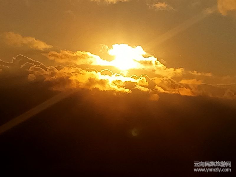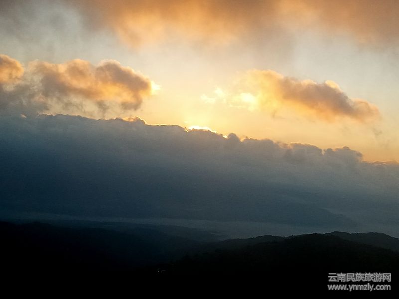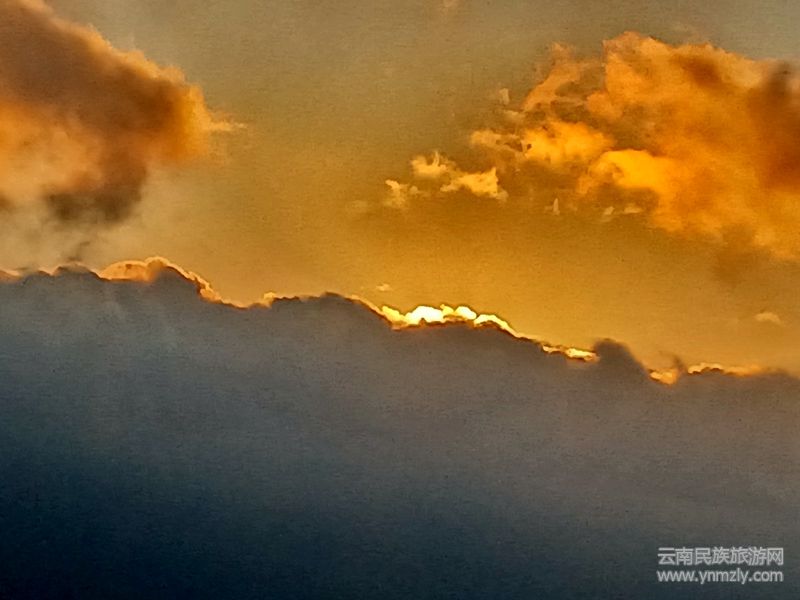 7點(diǎn)50分,東面高黎貢山之巔的一線(xiàn)紅光漸漸透視過(guò)云層,輻照著云層及江峽,紅光與亮光漸漸占了上風(fēng),且分分秒秒向上升騰,把高高在上的墨云染紅一條長(zhǎng)線(xiàn),又染成一圈紅暈,然后逐步散開(kāi),在山巔彌漫成出一片紅云。