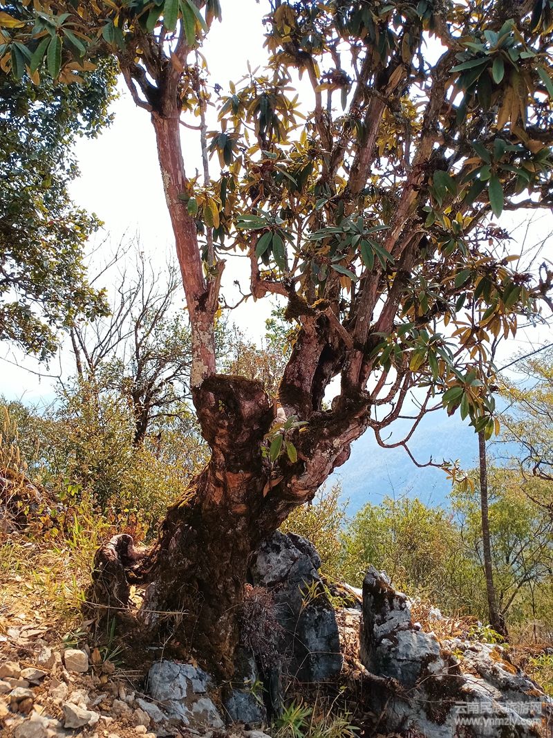 沿著天梯上行至半腰,道旁的一棵古老空心杜鵑,赫然在簇簇石蓮中間重獲勃勃生機,繁盛枝葉伸而出,猶如迎候賓客的手臂,恰似黃山迎客松,名為“杜鵑迎客”。