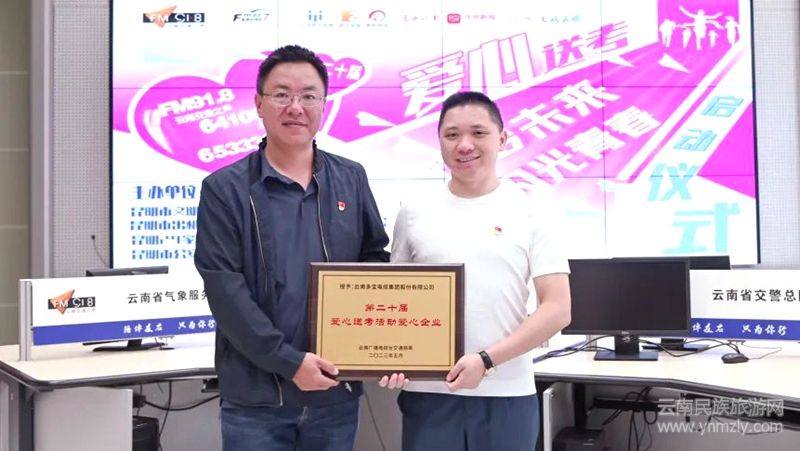 FM91.8云南交通之聲總監(jiān)施彥涵(左)為云南多寶電纜集團(tuán)股份有限公司總裁鄭曉彬(右)授牌