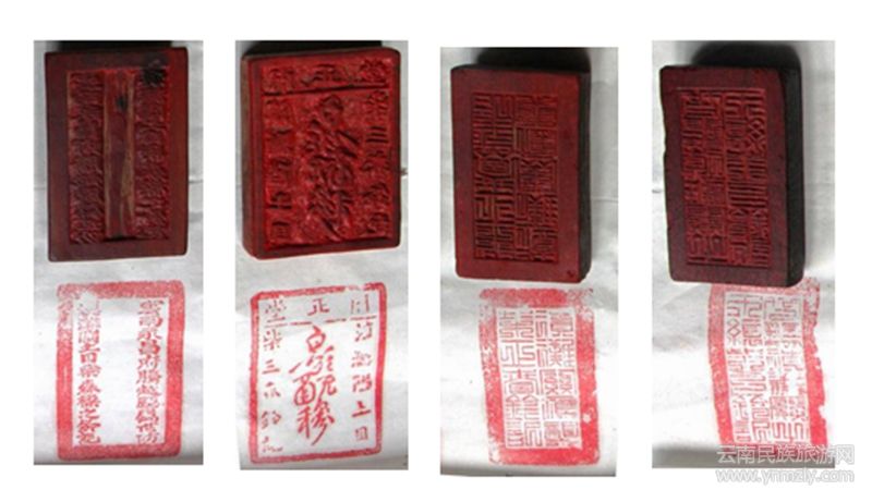 左一:云南永昌府騰越廳屬世防滇灘關(guān)土目柴森梁之鈐記;左二:滇灘隘土目柴三春鈐記;左三:滇灘關(guān)應(yīng)襲柴正春鈐記;左四:世襲滇灘關(guān)土千總柴之鈐記。