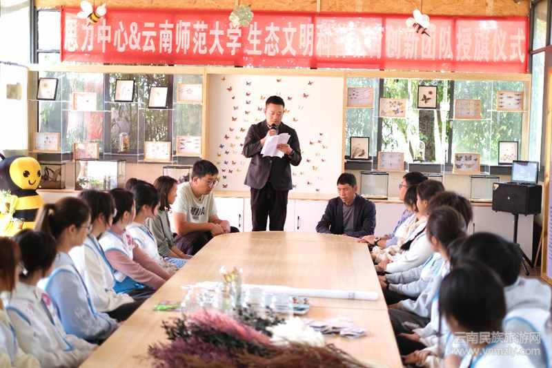 在授旗儀式上,云南師范大學(xué)團委副書記蘇斌、云南思力生態(tài)替代技術(shù)中心執(zhí)行主任左智、尋甸一丘田善態(tài)莊園董事長龔艷瓊分別致辭,祝賀生態(tài)文明科普教育創(chuàng)新團隊的正式成立,表示生態(tài)文明教育科普實踐不僅可以強化青年人對生態(tài)文明理念的認(rèn)識和理解,讓生態(tài)文明理念成為青年日常生活和學(xué)習(xí)中的自覺行為,塑造青年正確的生態(tài)觀;同時,通過富有創(chuàng)意和實踐的生態(tài)文明教育,可以激發(fā)青年的創(chuàng)新能力,培養(yǎng)有擔(dān)當(dāng)、有責(zé)任感的創(chuàng)新科普教育人才。