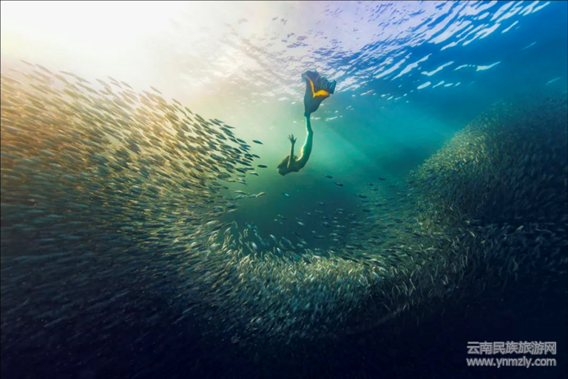 上圖是一幅精心拍攝又極其動(dòng)人的水下攝影,相信有無數(shù)的觀眾為此驚嘆和叫絕。陽光投射的水面下,數(shù)以萬千的沙丁魚像聽到某種神諭的召喚,簇?fù)矶鴣恚瑖@在美人魚一般的潛水員旁,組成了一幅神奇似乎又不可思議的畫面,猶如一位音樂指揮,奏起了海洋里瑰麗而激蕩的交響樂章;又更像海洋里的一個(gè)童話故事,給人以美的遐想和感染。