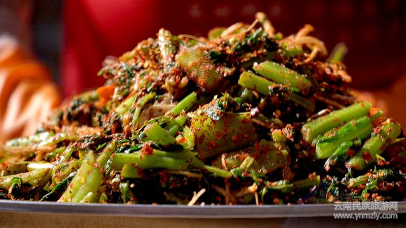 段狄經營的農家樂是每年消耗青菜的大戶,今年他與鎮(zhèn)安鎮(zhèn)八〇八社區(qū)達成合作,購買了20000斤的青菜來腌制腌菜。制作腌菜的方法很簡單,將青菜晾曬至水分半干,用手搓揉、洗凈、切成小塊后,再放上辣椒面、茴香面、甜白酒、紅糖等各種調料混合拌勻就制作好了。制作好的腌菜隨時都可以吃,是一道非常受歡迎的開胃小菜,也是當地制作各種美食菜肴必不可少的調味料。段狄介紹道:“我們今年跟鎮(zhèn)安鎮(zhèn)八〇八社區(qū)購買將近2萬斤的青菜用于制作臘腌菜。平時餐廳用于千張肉、酸辣魚、咸菜等,客戶是非常喜歡,每年的用量都比較大。”