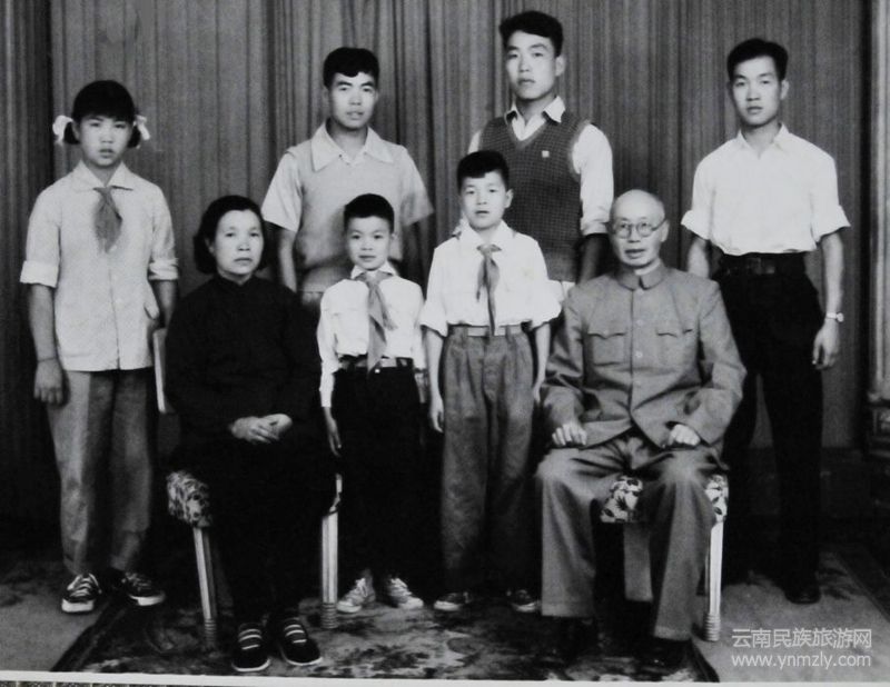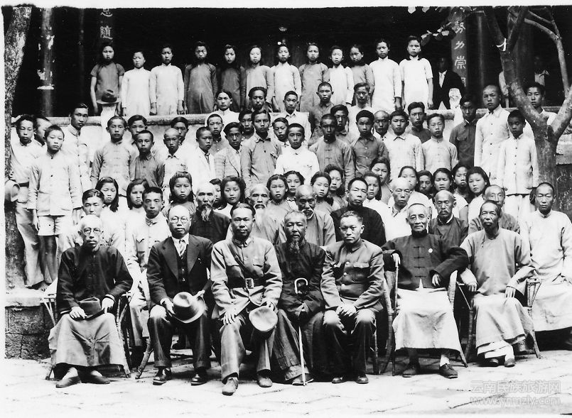 尹明德1948年騰沖益群中學(xué)復(fù)校時(shí)的合影。前排自左至右為李鴻美、尹明德、楊茂實(shí)、李根源、李國(guó)清、劉楚湘、李啟慈。后排有張德輝、“永茂和”三兄弟李德和(字致卿)、李德爵(字朝卿)、李德賢(字任卿)等 (賈志偉提供)