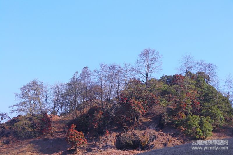 八彎埡口這個東高西低的圓形山包,當(dāng)?shù)赜址Q冒坡地,海拔2204.8米,經(jīng)度98.44,緯度25.61。在這個基本由石塊、石筍堆積而成的山包上,石筍、石巖嶙峋,低矮灌木叢,挺拔榿木樹與二、三十棵馬纓杜鵑花相伴共生,而大片古杜鵑,漫山遍野,格外火紅耀眼。