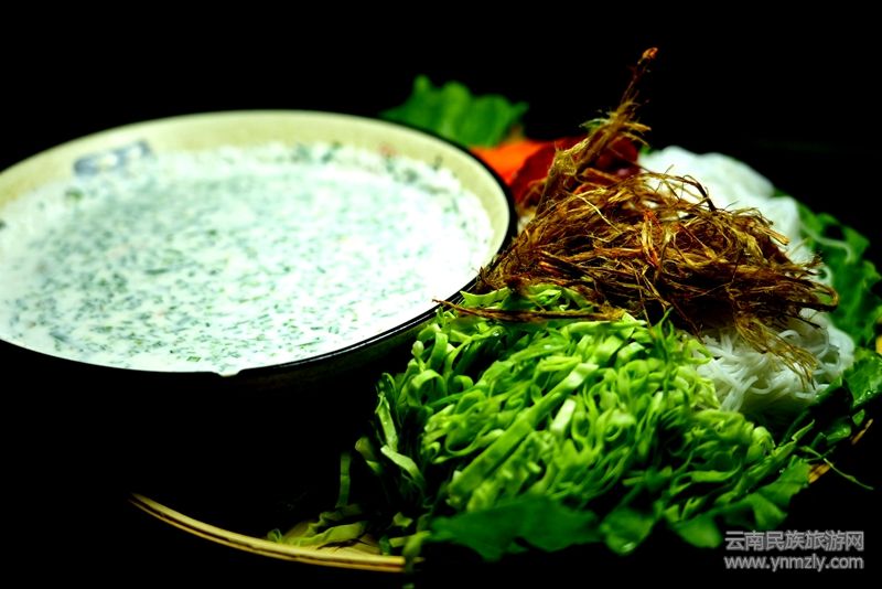 新鮮采摘來的堅果去殼洗凈用榨汁機榨成汁,再將新鮮韭菜切細(xì),配以切碎的香柳、緬芫荽、食鹽、辣椒面、味精、檸檬汁等調(diào)料拌勻,再倒入堅果汁就變成了一份鮮美的蘸料,燙好的米線搭配手撕牛干巴、胡蘿卜絲、包菜絲等配菜堅果撒就完成了。
