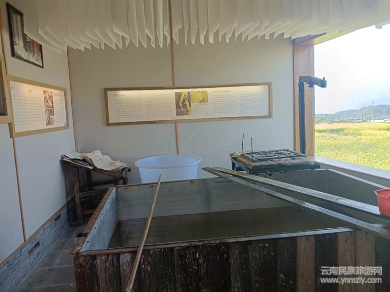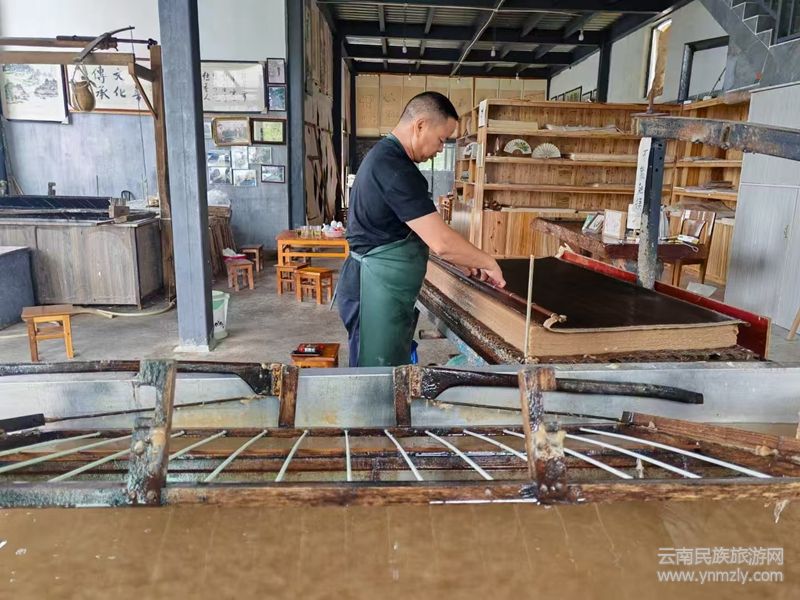 清代以前生產原始,操作笨重,工藝粗糙落后,清寸開泰《騰越鄉(xiāng)土志·物產》條目載:“構皮含漿粉,綿而有筋,漚流水中,取出,刮出粗皮,錘析之,再漚,乃以甑蒸,更錘極細,下灰缸泡濫如棉,以竹籮撈起,清水滌蕩,盡去灰質,碾研米漿,合(構)棉置缸中,同攪入化,用竹絲簾漾其面,輕提簾起,印板上層累有紙”,曬干成紙。“自購構而歸迄干成紙,前后手工計七十余次”,現已簡化,形成固定的工藝流程,且有不同之處。