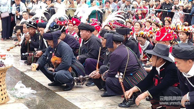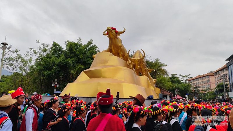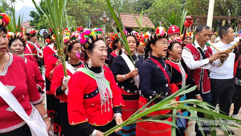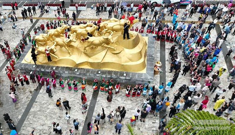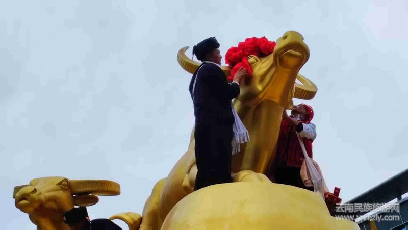 儀式現(xiàn)場,九頭牛雕塑前擺放著糯米粑粑、芭蕉、茶葉、糯米飯、米花、水果等。隨著主持人宣布儀式開始,百名佤族老人緩緩入場,洗牛頭、系紅布、戴紅花,游客們在祈福聲、蘆笙聲、傳統(tǒng)打歌調(diào)聲中體驗了一場別具佤族風(fēng)情的民俗活動。