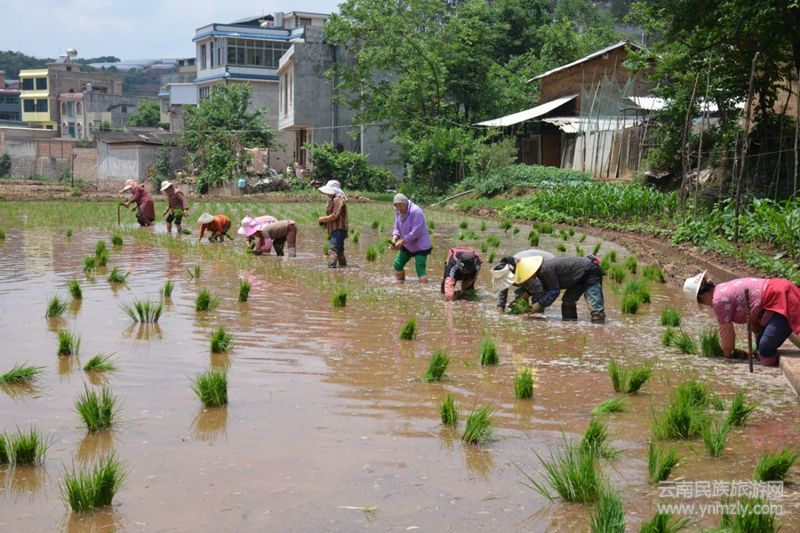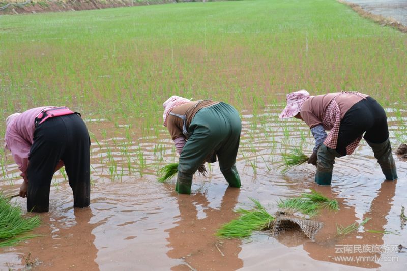 有個(gè)婦人在田間唱,大田栽秧在四方,鄉(xiāng)村農(nóng)民來栽秧,花海脫在田埂上,細(xì)皮嫩肉下泥漿。