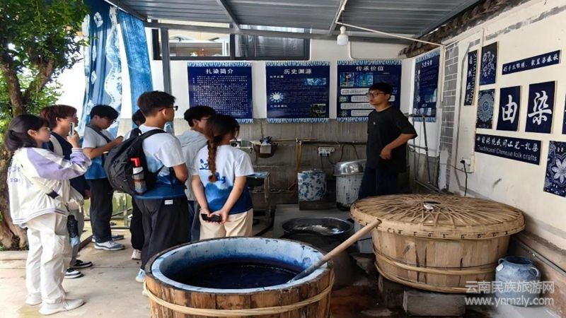 第六站,支教團(tuán)走進(jìn)染香院,沉浸式學(xué)習(xí)白族扎染。在傳承人講解下,了解白族扎染技藝的歷史淵源、文化寓意與工藝智慧。在近距離觀賞精美扎染成品后,成員們?cè)谥笇?dǎo)下嘗試扎結(jié)、捆綁、浸染。當(dāng)親手構(gòu)思的藍(lán)白圖案最終顯現(xiàn),成就感與敬意在成員們心中油然而生。這一過(guò)程不僅是技藝學(xué)習(xí),更是在藍(lán)白染韻的奇妙交織中,完成了一次對(duì)專(zhuān)注、創(chuàng)新與傳承責(zé)任的淳樸匠心。
